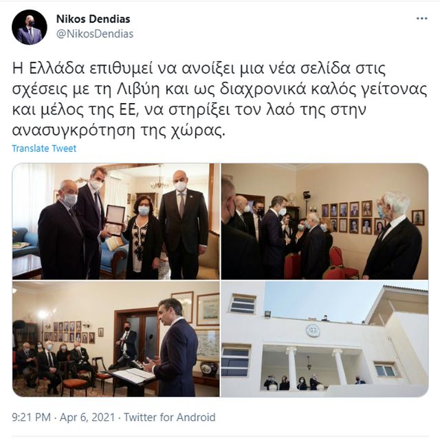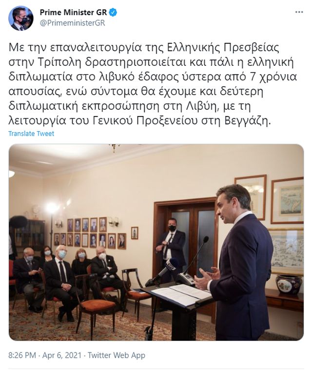 Αναρτήσεις από την Πρεσβεία της χώρας μας στην Τρίπολη έκανε στο Twitter και ο πρωθυπουργός Κυριάκος Μητσοτάκης.