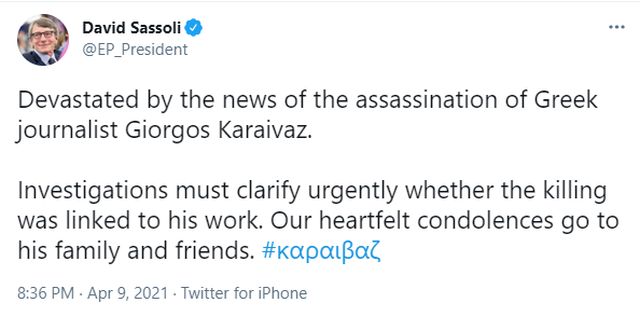 «Συντετριμμένος από την είδηση της δολοφονίας του Έλληνα δημοσιογράφου Γιώργου Καραϊβάζ.