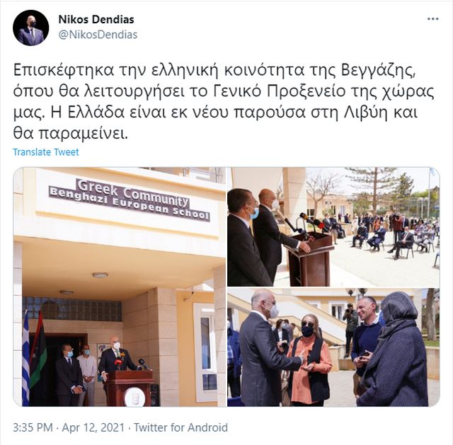 Σημειώνεται ότι ο κ. Δένδιας παρέστη και σε σύντομη τελετή στο «Ευρωπαϊκό Σχολείο» της Ελληνικής κοινότητας της Βεγγάζης, όπου συναντήθηκε με μέλη της κοινότητας.