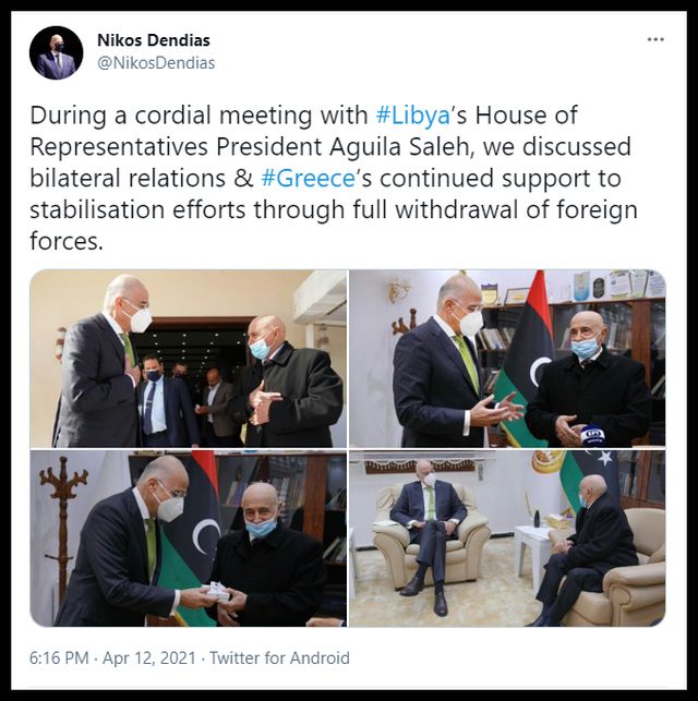 Η επίσκεψη τη Δευτέρα του Νίκου Δένδια στην Κυρηναϊκή (Ανατολική Λιβύη), Βεγγάζη και Αλ Κούμπα, Al Cubbah), μία εβδομάδα μετά την επίσκεψη του Κυριάκου Μητσοτάκη στη Λιβύη, αποσκοπούσε, σύμφωνα με ελληνικές διπλωματικές πηγές, στην εμπέδωση των μηνυμάτων όσον αφορά το παράνομο και ανυπόστατο «τουρκο-λιβυκό μνημόνιο» και την αποφυγή, σε πρώτη φάση οποιασδήποτε πρωτοβουλίας που θα δυσχέρανε τις σχέσεις της Λιβύης τόσο με την Ελλάδα, όσο και με την Ευρωπαϊκή Ένωση, την εμπέδωση της ελληνικής παρουσίας με την ίδρυση του Γενικού Προξενείου στη Βεγγάζη, και την συνεισφορά στη χώρα για την ανοικοδόμηση της Λιβύης.