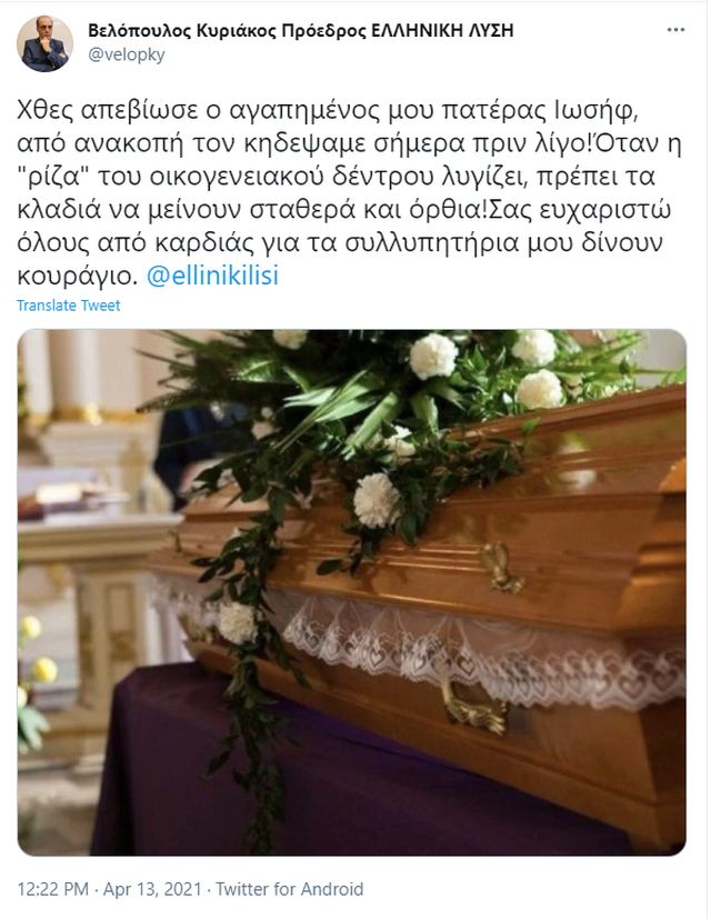 Βαρύ πένθος για τον πρόεδρο της Ελληνικής Λύσης Κυριάκο Βελόπουλο καθώς έφυγε από τη ζωή ο πατέρας του.