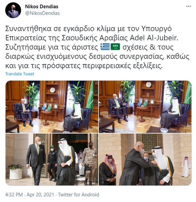«Συζητήσαμε για τις άριστες ελληνο-σαουδαραβικές σχέσεις και τους διαρκώς ενισχυόμενους δεσμούς συνεργασίας, καθώς και για τις πρόσφατες περιφερειακές εξελίξεις» έγραψε μετά τη συνάντηση στον προσωπικό του λογαριασμό το Twitter ο Νίκος Δένδιας.