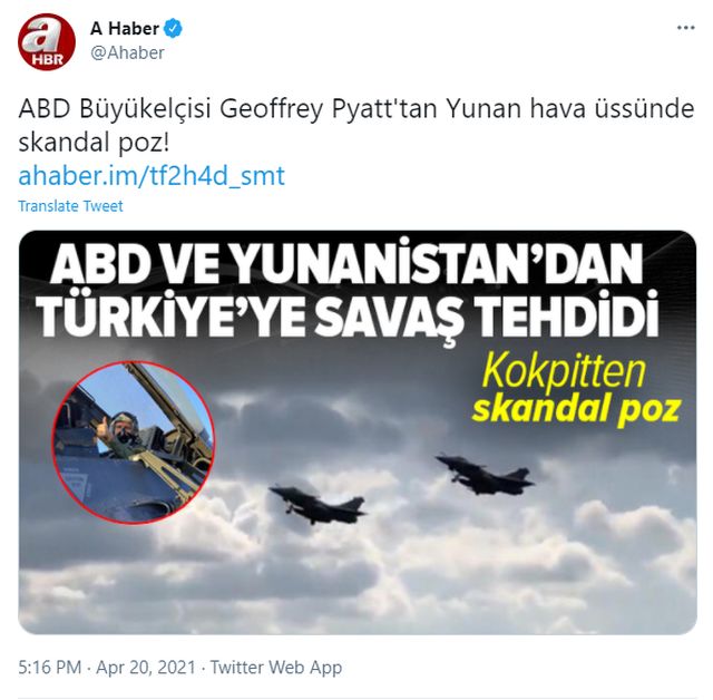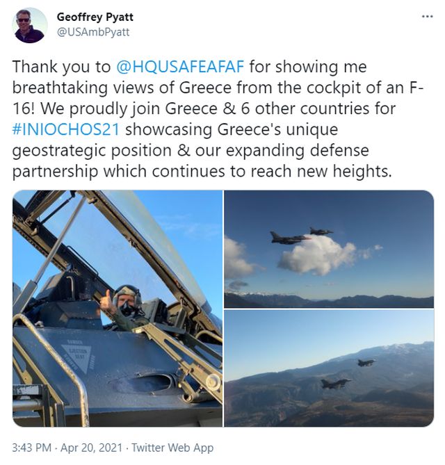 Η φωτογραφία του Αμερικανού πρεσβευτή στην Αθήνα, Τζέφρι Πάιατ, μέσα στο πιλοτήριο ενός αμερικανικού F-16 που συμμετέχει στην άσκηση «Ηνίοχος 21», «τρέλανε» τους Τούρκους.