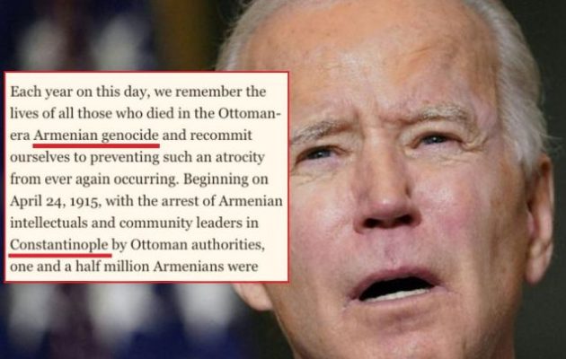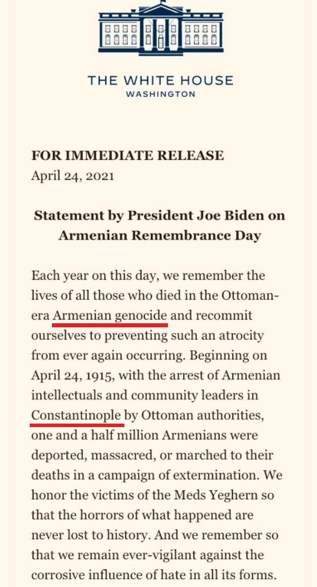 Στο ιστορικό μήνυμά του το Σάββατο 24/04/21 ο Τζο Μπάιντεν, με το οποίο κατά παγκόσμια παραδοχή αναγνώρισε τη Γενοκτονία των Αρμενίων πριν 106 χρόνια από την Οθωμανική Αυτοκρατορία, εξαπέλυσε ακόμα ένα ισχυρό πλήγμα στην Τουρκία, που επισκιάστηκε σε πρώτη ανάγνωση λόγω του αρμενικού ζητήματος. Ποιο είναι αυτό; Ο Αμερικανός πρόεδρος αναφέρθηκε σε Κωνσταντινούπολη (Constantinople) και όχι «Ιστανμπούλ».