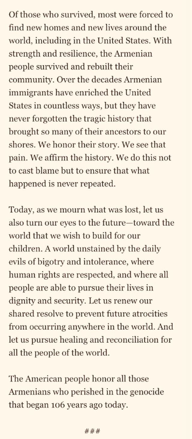 Αναφερόμενος ο Αμερικανός πρόεδρος στο μήνυμά του στην έναρξη της Αρμενικής Γενοκτονίας την 24η Απριλίου του 1915, όταν η ηγεσία της αρμενικής κοινότητας της Κωνσταντινούπολης φυλακίστηκε και εκατοντάδες Αρμένιοι της Πόλης απαγχονίστηκαν, επιθυμεί να είναι ιστορικά συνεπής για αυτό και χρησιμοποιεί το επίσημο όνομα της πόλης το 1915, που ήταν Κωνσταντινούπολη και όχι «Ιστανμπούλ».
