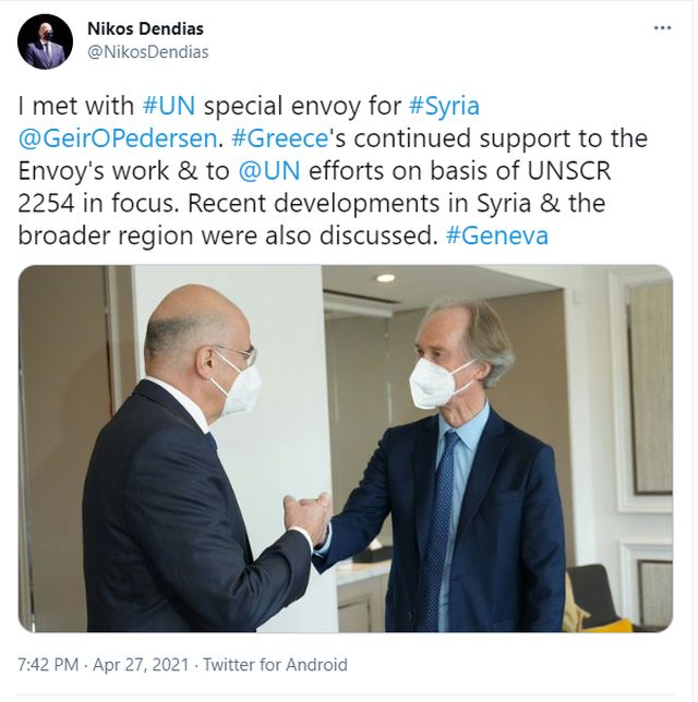 «Συζητήσαμε τη σταθερή στήριξη της Ελλάδας στο έργο του Ειδικού Απεσταλμένου και τις προσπάθειες του ΟΗΕ, στη βάση της Απόφασης 2254 ΣΑ του ΟΗΕ, για τις εξελίξεις στη Συρία και την ευρύτερη περιοχή», έγραψε ο Νίκος Δένδιας σε ανάρτησή του στο Twitter.