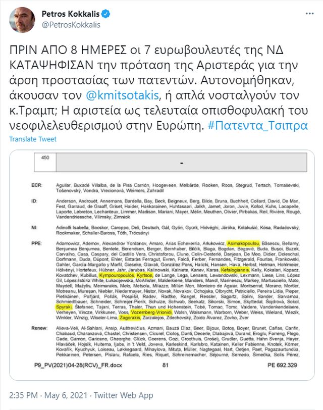 «Πριν από οκτώ ημέρες οι επτά ευρωβουλευτές της ΝΔ καταψήφισαν την πρόταση της Αριστεράς για την άρση προστασίας των πατεντών», επισημαίνει με ανάρτησή του στο Twitter ο ευρωβουλευτής του ΣΥΡΙΖΑ-ΠΣ, Πέτρος Κόκκαλης, και συνεχίζει: