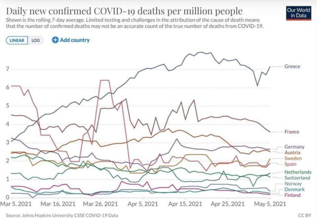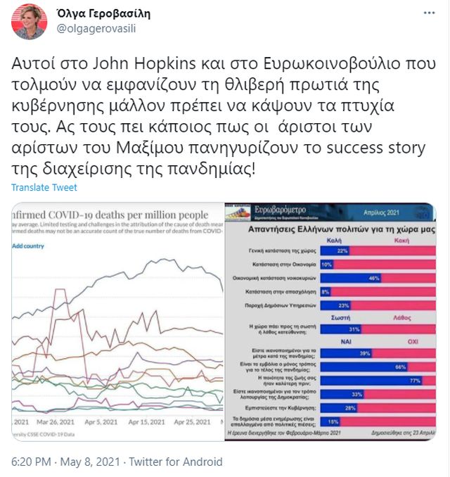 Η πρώην υπουργός δημοσιεύει πίνακα του πανεπιστημίου John Hopkins που δείχνει τη χώρα μας αυτή τη στιγμή πρώτη σε θανάτους παγκοσμίως.
