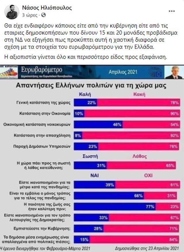 «Θα είχε ενδιαφέρον κάποιος είτε από την κυβέρνηση είτε από τις εταιρίες δημοσκοπήσεων που δίνουν 15 και 20 μονάδες προβάδισμα στη ΝΔ να εξηγήσει πως προκύπτει αυτή η χαοτική διαφορά σε σχέση με τα στοιχεία του ευρωβαρόμετρου για την Ελλάδα», επισημαίνει σε ανάρτησή του στο Facebook ο Νάσος Ηλιόπουλος, σχολιάζοντας τη δημοσκόπηση του Ευρωβαρόμετρου.