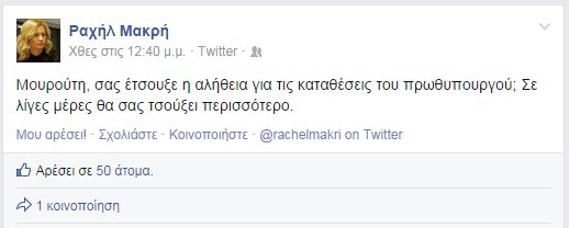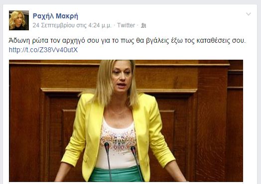 Με μια αιχμηρή ανάρτηση στο facbook η βουλευτής των Ανεξάρτητων Ελλήνων, Ραχήλ Μακρή, δίνει συνέχεια στην προηγούμενη καταγγελία που είχε κάνει ότι ο Πρωθυπουργός είχε βγάλει τα λεφτά του στο εξωτερικό.