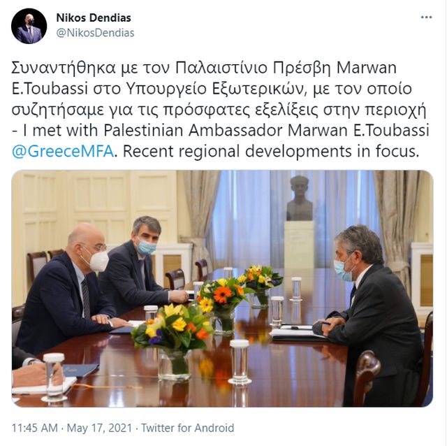 Ενημέρωση 14.40: Ο υπουργός Εξωτερικών Νίκος Δένδιας επισκέπτεται το Ισραήλ, τα Παλαιστινιακά εδάφη και την Ιορδανία (18 Μαΐου 2021), καθώς και στην Αίγυπτο (20 Μαΐου 2021).