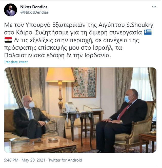 «Συζητήσαμε για τη διμερή συνεργασία Ελλάδας και Αιγύπτου και τις εξελίξεις στην περιοχή, σε συνέχεια της πρόσφατης επίσκεψής μου στο Ισραήλ, τα Παλαιστινιακά εδάφη και την Ιορδανία» έγραψε στο Twitter ο Νίκος Δένδιας.