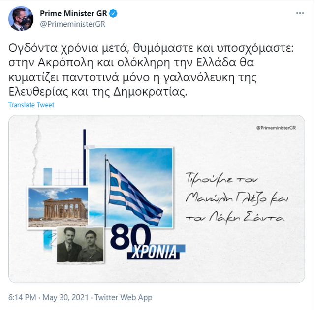 «Ογδόντα χρόνια μετά, θυμόμαστε και υποσχόμαστε: στην Ακρόπολη και ολόκληρη την Ελλάδα θα κυματίζει παντοτινά μόνο η γαλανόλευκη της Ελευθερίας και της Δημοκρατίας», έγραψε ο πρωθυπουργός.