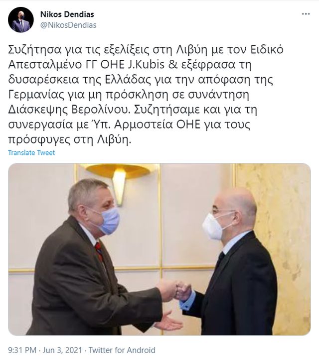 Ο υπουργός Εξωτερικών Νίκος Δένδιας συζήτησε τις εξελίξεις στη Λιβύη, όπως και την Διάσκεψη του Βερολίνου από την οποία αποκλείστηκε η Ελλάδα, σε τηλεφωνική επικοινωνία με τον ειδικό απεσταλμένο του γενικού γραμματέα του ΟΗΕ, Γιαν Κούμπις (Jan Kubis).