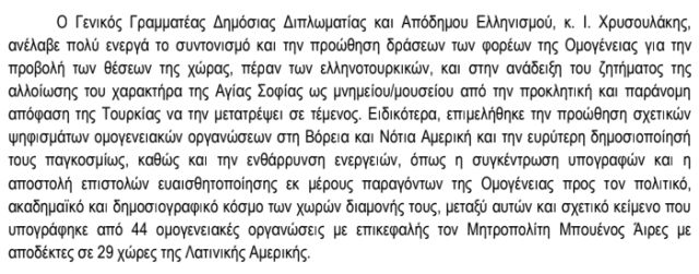 Ιδιαίτερα σημαντικός είναι ο ρόλος του Γενικού Γραμματέα Δημόσιας Διπλωματίας και Απόδημου Ελληνισμού Ιωάννη Χρυσουλάκη ο οποίος ανέλαβε τον συντονισμό και τη προώθηση δράσεων των φορέων της Ομογένειας για τη προβολή των θέσεων της χώρας, πέραν των ελληνοτουρκικών και όπως αναφέρει χαρακτηριστικά ο κ. Δένδιας, συνέβαλε «στην ανάδειξη του ζητήματος της αλλοίωσης του χαρακτήρα της Αγίας Σοφίας ως μνημείου/μουσείου από την προκλητική και παράνομη απόφαση της Τουρκίας να την μετατρέψει σε τέμενος».