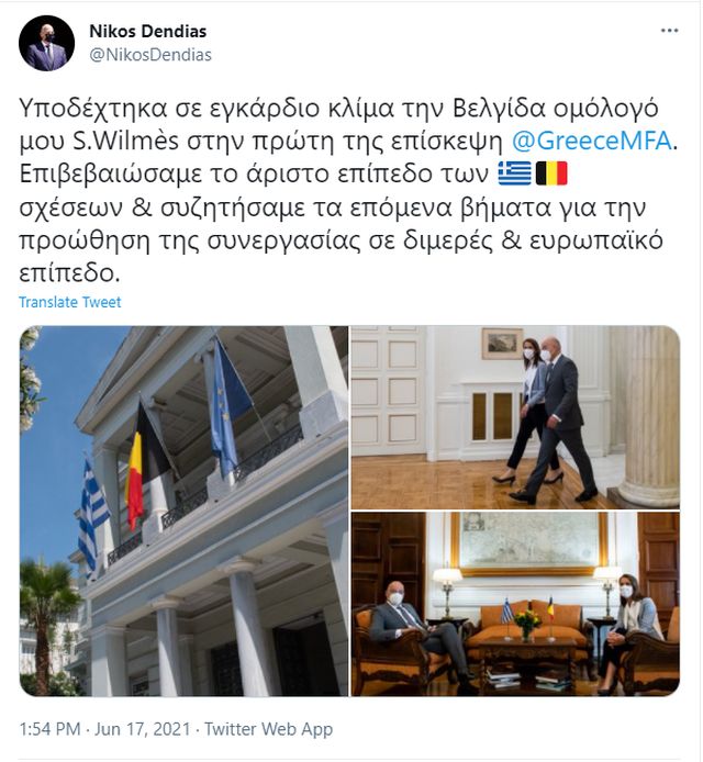 »Επιβεβαιώσαμε το άριστο επίπεδο των Ελληνικών και Βελγικών σχέσεων και συζητήσαμε τα επόμενα βήματα για την προώθηση της συνεργασίας σε διμερές και ευρωπαϊκό επίπεδο».