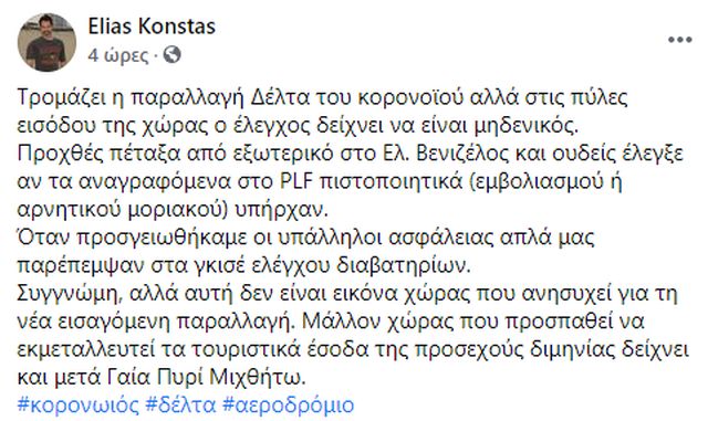 Ο αντιπρόεδρος της Δημιουργίας Ξανά, Ηλίας Κώνστας, καταγγέλλει, με ανάρτησή του στο Facebook, μηδενικούς ελέγχους για κορωνοϊό στο «Ελ. Βενιζέλος» στους ταξιδιώτες που έρχονται από το εξωτερικό. Αναφέρει: