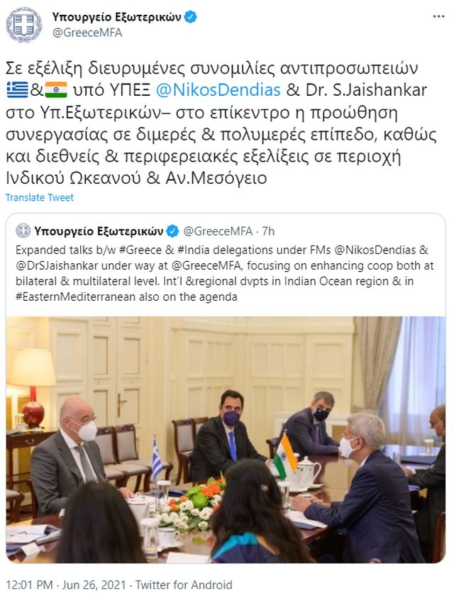 Επιπλέον, οι δύο υπουργοί Εξωτερικών συζήτησαν για τη συνεργασία των δύο χωρών στο πλαίσιο και διαφόρων άλλων σχημάτων, αρχής γενομένης από τον ΟΗΕ, στον οποίο η Ινδία είναι μέλος του Συμβουλίου Ασφαλείας για την περίοδο 2021-2022 και η Ελλάδα είναι υποψήφια για μια θέση μη μόνιμου μέλους για την περίοδο 2025-2026.