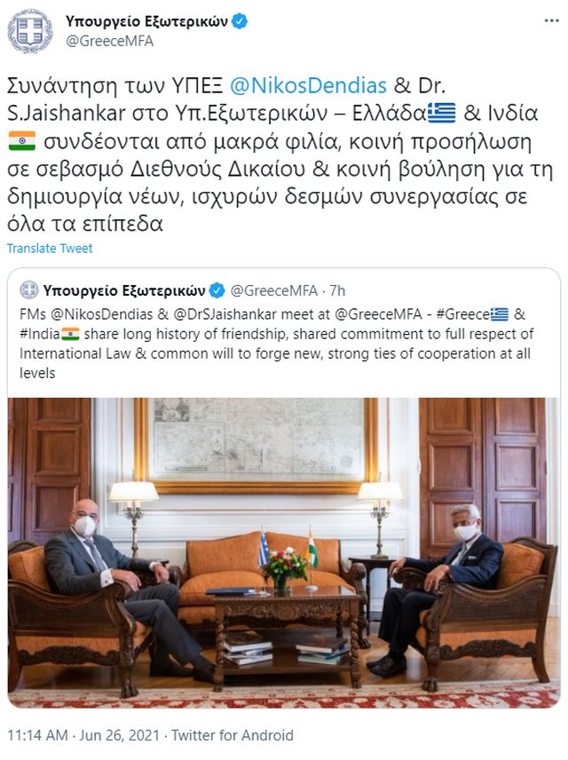 Το μήνυμα πως ως «δημοκρατίες, το κράτος δικαίου και ο σεβασμός της εδαφικής ακεραιότητας και κυριαρχίας αποτελούν εξαιρετικά θεμελιώδεις αρχές που είναι το θεμέλιο του Διεθνούς Δικαίου», έστειλε ο υπουργός Εξωτερικών της Ινδίας Δρ Σουμπραχμανιάμ Τζαϊσχανκάρ (Subrahmanyam Jaishankar).