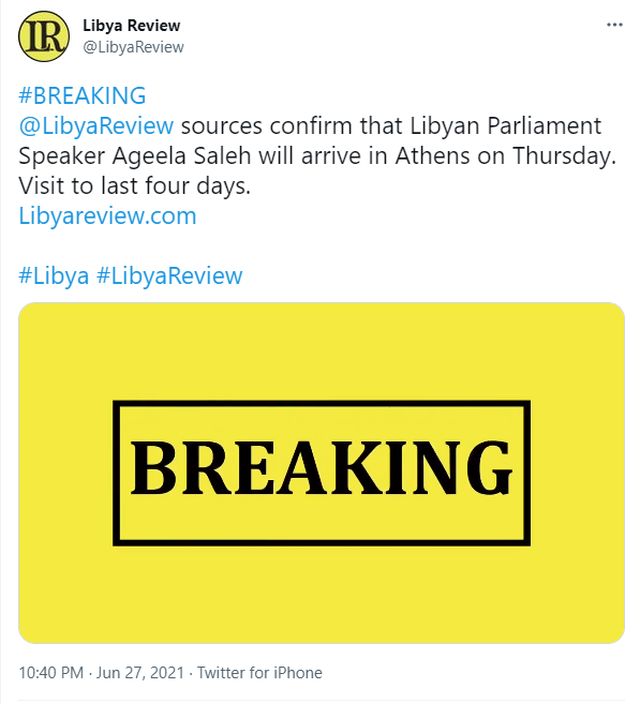 Όπως μετέδωσε το βράδυ της Κυριακής η ιστοσελίδα Libya Review, σε ανάρτησή της στο Twitter, την Πέμπτη αναμένεται στην Αθήνα ο πρόεδρος της λιβυκής Βουλής των Αντιπροσώπων, Ακίλα Σάλεχ.