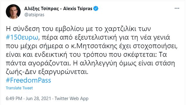 Κριτική στο μέτρο που ανακοίνωσε ο πρωθυπουργός για την προπληρωμένη κάρτα 150 ευρώ σε όσους νέους μέχρι 25 ετών εμβολιάζονται ασκεί ο πρόεδρος του ΣΥΡΙΖΑ-ΠΣ, Αλέξης Τσίπρας με ανάρτησή του στο Twitter.