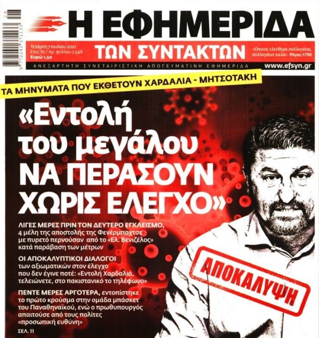 Λίγο πριν από το δεύτερο οριζόντιο λοκντάουν, με εντολή Χαρδαλιά, παρά τα περιοριστικά μέτρα που ίσχυαν, πέρασαν από το αεροδρόμιο τέσσερα άτομα της συνοδείας της τουρκικής μπασκετικής ομάδας Φενέρμπαχτσε που είχαν πυρετό, σύμφωνα με αποκάλυψη της Εφημερίδας των Συντακτών.
