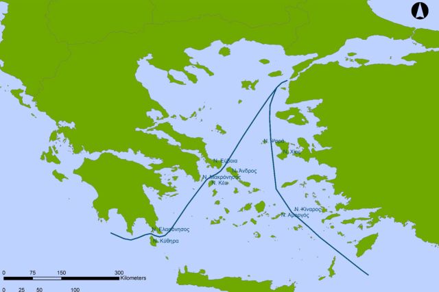 Ας δούμε όμως τον συνημμένο χάρτη (συν. 1), με τις δύο κύριες γραμμές ναυσιπλοΐας στο Αιγαίο, ήτοι την Δυτική από Ελλήσποντο προς Ιόνιο και την Ανατολική από Ελλήσποντο προς Ανατολική Μεσόγειο.