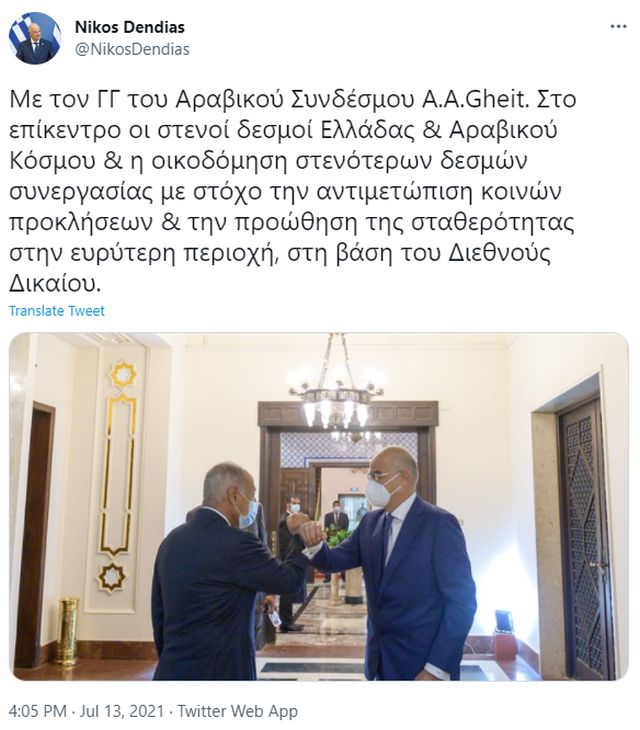 «Με τον ΓΓ του Αραβικού Συνδέσμου A.A.Gheit. Στο επίκεντρο οι στενοί δεσμοί Ελλάδας και Αραβικού Kόσμου και η οικοδόμηση στενότερων δεσμών συνεργασίας με στόχο την αντιμετώπιση κοινών προκλήσεων και την προώθηση της σταθερότητας στην ευρύτερη περιοχή, στη βάση του Διεθνούς Δικαίου».
