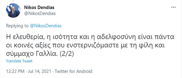 «Η ελευθερία, η ισότητα και η αδελφοσύνη είναι πάντα οι κοινές αξίες που ενστερνιζόμαστε με τη φίλη και σύμμαχο Γαλλία».
