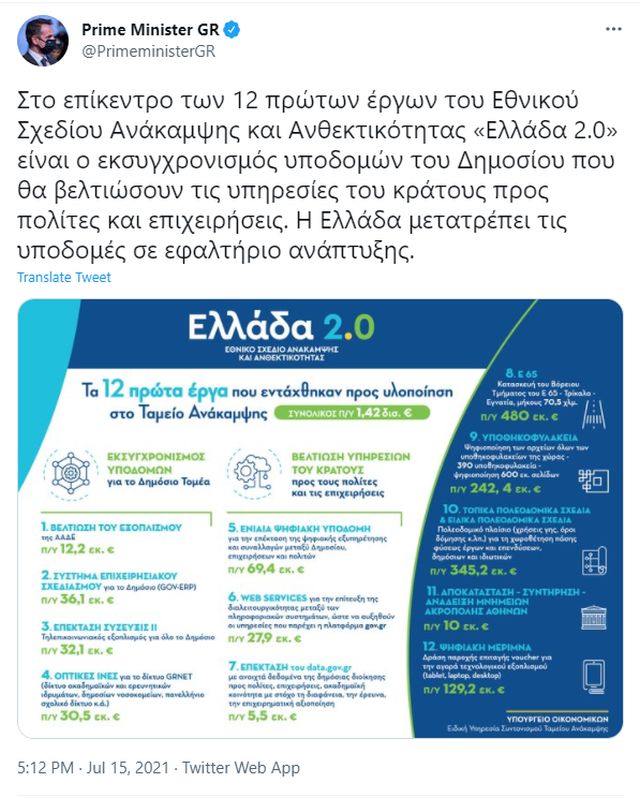 «Στο επίκεντρο των πρώτων 12 έργων του Εθνικού Σχεδίου Ανάκαμψης και Ανθεκτικότητας “Ελλάδα 2.0” είναι ο εκσυγχρονισμός υποδομών του Δημοσίου, που θα βελτιώσουν τις υπηρεσίες του κράτους προς πολίτες και επιχειρήσεις.