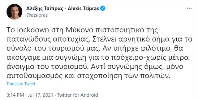 Την ώρα που παταγωδώς καταρρέει το κυβερνητικό αφήγημα ότι δήθεν ο κορωνοϊός «δεν κολλάει» από τον τουρισμό, «οι εμβολιασμένοι τουρίστες είναι ασφαλείς» έλεγαν (δείτε εδώ), και μετά το έκτακτο λοκντάουν που επιβλήθηκε το Σάββατο στη Μύκονο, ενώ και άλλα νησιά βρίσκονται στην «καυτή» ζώνη, ο αρχηγός της αξιωματικής αντιπολίτευσης, Αλέξης Τσίπρας, εξαπέλυσε δριμεία επίθεση στην κυβέρνηση: