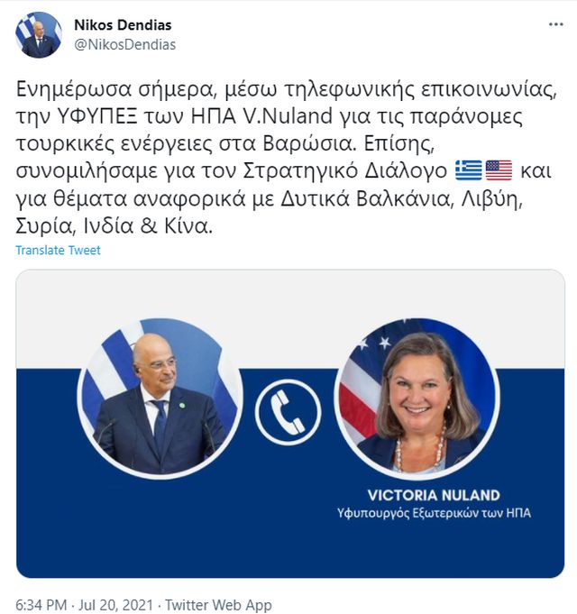Σε τηλεφωνική επικοινωνία την Τρίτη, ο υπουργός Εξωτερικών Νίκος Δένδιας ενημέρωσε την υφυπουργό Εξωτερικών των ΗΠΑ Βικτόρια Νούλαντ για τις παράνομες τουρκικές ενέργειες στα Βαρώσια.