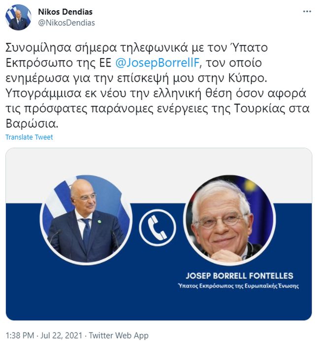 Διαβάστε σχετικά για Αμμόχωστος, Βαρώσια, Ευρωπαϊκή Ένωση, Ζοζέπ Μπορέλ, Κυπριακό Ζήτημα, Κύπρος, Νίκος Δένδιας, Τουρκία, Υπουργείο Εξωτερικών,