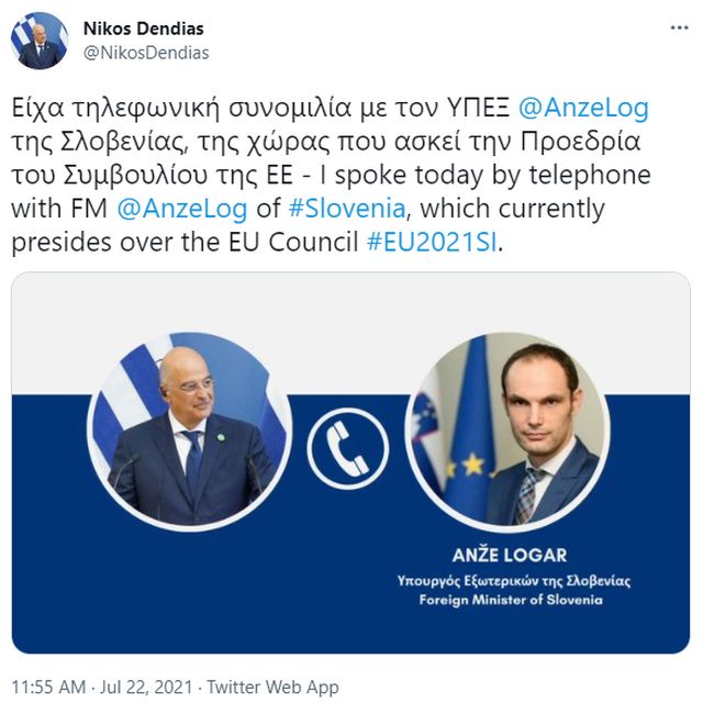 Τηλεφωνική επικοινωνία με τον υπουργό Εξωτερικών της Σλοβενίας, Άνζε Λόγκαρ, πραγματοποίησε, νωρίτερα σήμερα Πέμπτη, ο υπουργός Εξωτερικών, Νίκος Δένδιας, σύμφωνα με σχετική ανάρτηση του υπουργείου Εξωτερικών στο twitter.