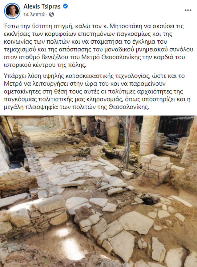 «Έστω την ύστατη στιγμή, καλώ τον κ. Μητσοτάκη να ακούσει τις εκκλήσεις των κορυφαίων επιστημόνων παγκοσμίως και της κοινωνίας των πολιτών και να σταματήσει το έγκλημα του τεμαχισμού και της απόσπασης του μοναδικού μνημειακού συνόλου στον σταθμό Βενιζέλου του Μετρό Θεσσαλονίκης την καρδιά του ιστορικού κέντρου της πόλης.