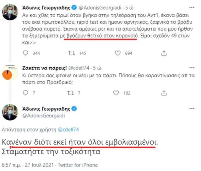 »Αφού ο Γεωργιάδης διέψευσε ότι είναι η δεύτερη φορά που προσβάλλεται από κορονοϊό, γεγονός που θα τον έκανε μοναδική περίπτωση παγκοσμίως, σε διάλογο που είχε με χρήστη του Twitter έγραψε τα ακόλουθα:
