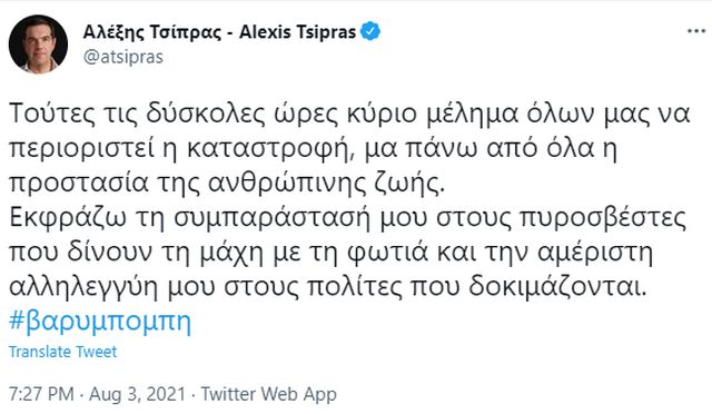 Τη συμπαράστασή του στους πυροσβέστες που δίνουν μάχη με τις φλόγες και στους πολίτες που δοκιμάζονται από τη φωτιά στη Βαρυμπόμπη εξέφρασε ο Αλέξης Τσίπρας.