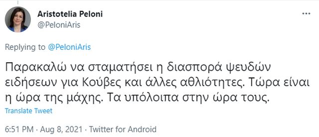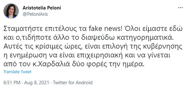 «Σταματήστε επιτέλους τα fake news! Όλοι είμαστε εδώ και ο,τιδήποτε άλλο το διαψεύδω κατηγορηματικά», έγραψε η Αριστοτελία Πελώνη στο Twitter, της οποίας η «εξαφάνιση» τις προηγούμενες ημέρες δεν πέρασε απαρατήρητη.