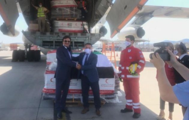 Στις φωτογραφίες που ανάρτησε η εμιρατιανή πρεσβεία στο Twitter φαίνεται η παραλαβή της βοήθειας από τον ελληνικό Ερυθρό Σταυρό.