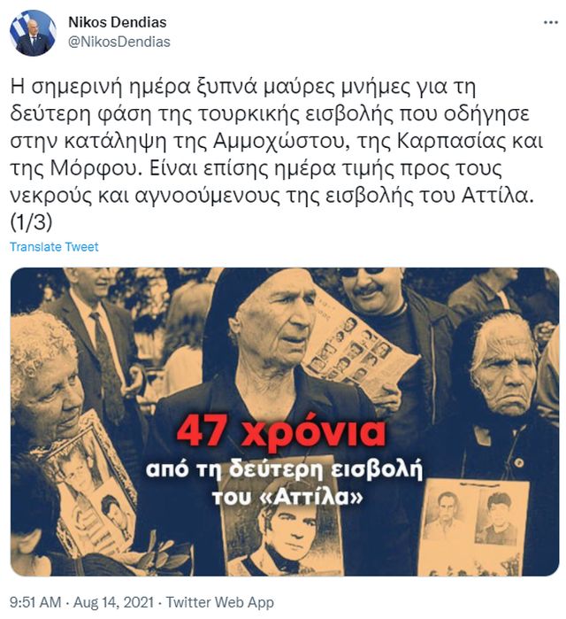 Με αφορμή τη μαύρη επέτειο του δεύτερου «Αττίλα» στην Κύπρο, ο υπουργός Εξωτερικών, Νίκος Δένδιας, με σειρά αναρτήσεών του στο Twitter διαμήνυσε ότι η Ελλάδα δεν θα πάψει ποτέ να βρίσκεται στο πλευρό της Κύπρου. Ο Νίκος Δένδιας έγραψε: