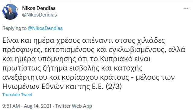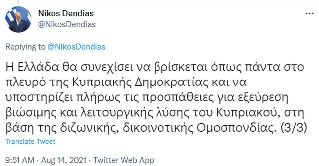 »Η Ελλάδα θα συνεχίσει να βρίσκεται όπως πάντα στο πλευρό της Κυπριακής Δημοκρατίας και να υποστηρίζει πλήρως τις προσπάθειες για εξεύρεση βιώσιμης και λειτουργικής λύσης του Κυπριακού, στη βάση της διζωνικής, δικοινοτικής Ομοσπονδίας», καταλήγει ο υπουργός Εξωτερικών της Ελλάδας.