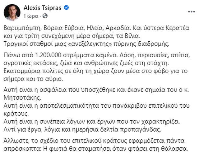 Ειδικότερα, σε ανάρτηση του στο Facebook, ο κ. Τσίπρας αναφέρει: