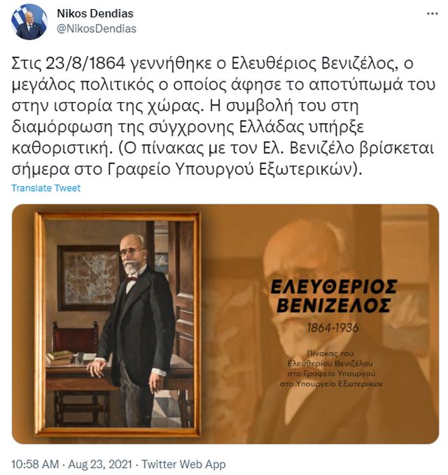 Ο υπουργός Εξωτερικών, στον οποίο οι φιλίστορες διακρίνουν μια βενιζέλεια γεωπολιτική παράδοση της περιόδου της νίκης, του θριάμβου και της επέκτασης, έγραψε στο Twitter για τα γενέθλια του Ελ. Βενιζέλου: