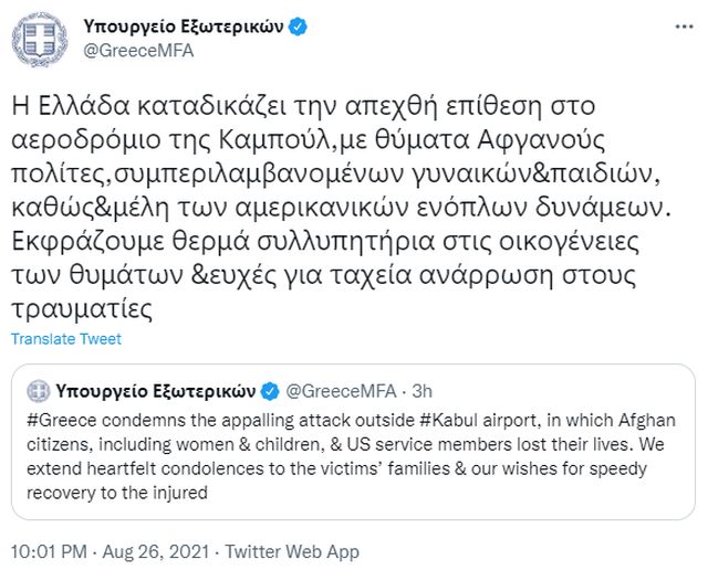 «Η Ελλάδα καταδικάζει την απεχθή επίθεση στο αεροδρόμιο της Καμπούλ, με θύματα Αφγανούς πολίτες, συμπεριλαμβανομένων γυναικών και παιδιών, καθώς και μέλη των αμερικανικών ενόπλων δυνάμεων», αναφέρει το υπουργείο Εξωτερικών με ανάρτησή του στο twitter.