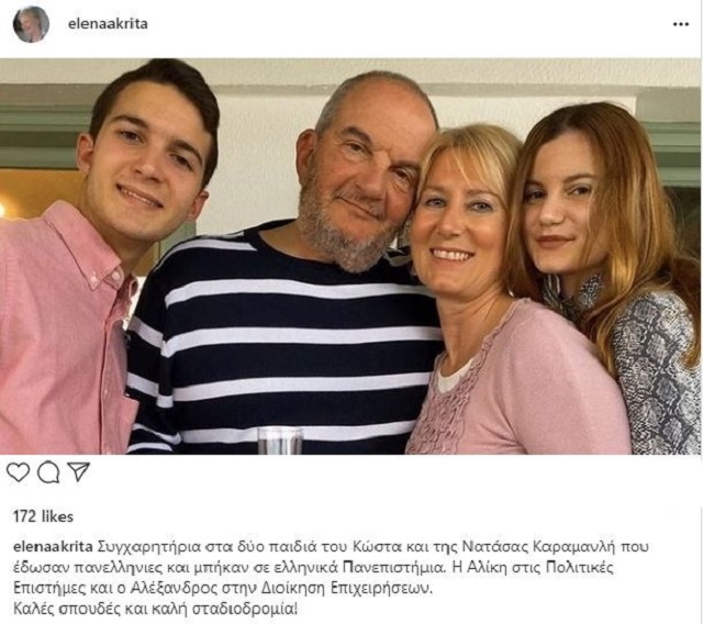 Την αποκάλυψη της επιτυχίας τους έκανε, μέσα από μια ανάρτηση στον λογαριασμό της στο Instagram η Έλενα Ακρίτα που θέλησε να συγχαρεί τα παιδιά του Κώστα Καραμανλή και της Νατάσας Παζαϊτη για την επιτυχία τους στις Πανελλήνιες.