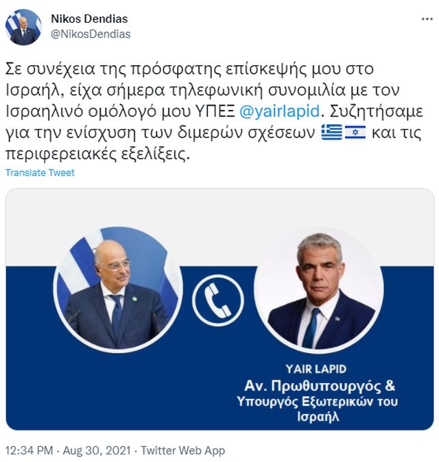 «Σε συνέχεια της πρόσφατης επίσκεψής μου στο Ισραήλ, είχα σήμερα τηλεφωνική συνομιλία με τον Ισραηλινό ομόλογό μου ΥΠΕΞ Γιαΐρ Λαπίντ.