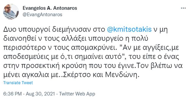 «Δυο υπουργοί διεμήνυσαν στον Κυριάκο Μητσοτάκη να μη διανοηθεί να τους αλλάξει υπουργείο ή πολύ περισσότερο να τους απομακρύνει.