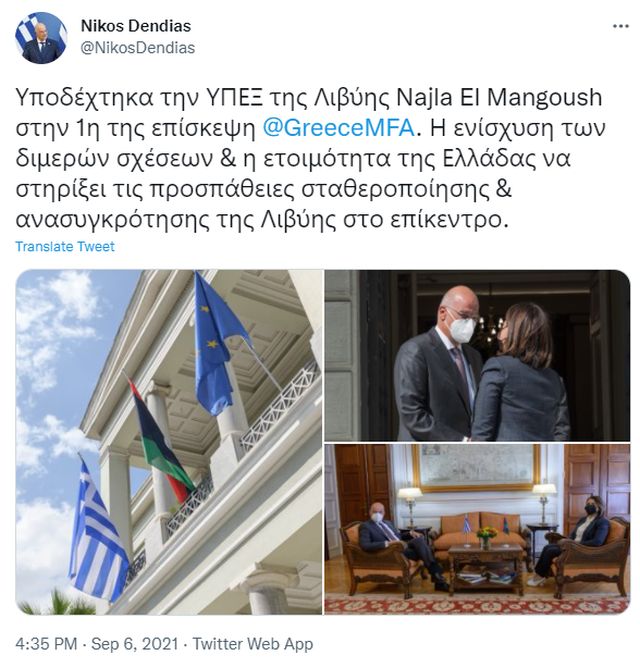 «Υποδέχτηκα την ΥΠΕΞ της Λιβύης Najla El Mangoush στην 1η της επίσκεψη στο ελληνικό υπουργείο Εξωτερικών.