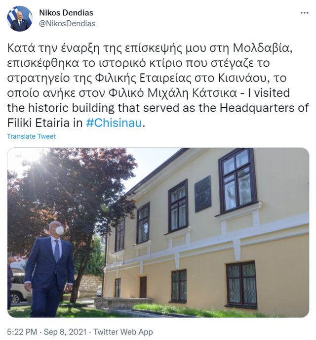«Κατά την έναρξη της επίσκεψής μου στη Μολδαβία, επισκέφθηκα το ιστορικό κτίριο που στέγαζε το στρατηγείο της Φιλικής Εταιρείας στο Κισινάου, το οποίο ανήκε στον Φιλικό Μιχάλη Κάτσικα», έγραψε στο Twitter ο υπουργός Εξωτερικών.