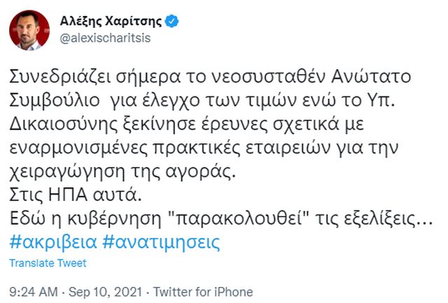 Στις ΗΠΑ συνεδριάζει συνεδριάζει το Ανώτατο Συμβούλιο για έλεγχο των τιμών και στην Ελλάδα η κυβέρνηση «παρακολουθεί» τις εξελίξεις, σχολιάζει αιχμηρά στο Twitter ο Αλέξης Χαρίτσης: